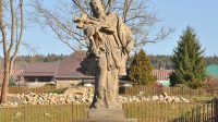 Na travnaté ploše u hlavní křižovatky v Brtníkách stojí stále ještě novotou svítící socha svatého Jana Nepomuckého.