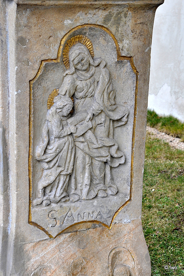 Alespoň laicky – na základovém schodu v trávníku stojí hranolový podstavec, ukončený římsou s volutou a mušlí na čelní straně. Na třech stranách soklu jsou reliéfy, na zadní straně nápis. Na čelní straně zřejmě sv. Josef s Ježíškem a lilií, vpravo sv. Anna s dcerou Marií, čtoucí v knize, kterou Anna drží, vlevo je sv. Jáchym (otec Marie) s pastýřskou holí a knihou, kterou si levou rukou přidržuje opřenou o bok. Nápis na zadní straně latinsky se jménem donátora a letopočtem 1773. Nad římsou menší zužující se podstavec, na němž stojí socha Panny Marie v naději. Ta stojí s mírně ukloněnou hlavou k pravé ruce, ruce rozpažené před sebe s dlaněmi vpřed. Kolem hlavy drátová svatozář se 12 hvězdami. Pod přehozeným pláštěm šaty, uvázané pod prsy nad zdůrazněným břichem na mašli. Šaty zdobené zlacenými ornamenty.
