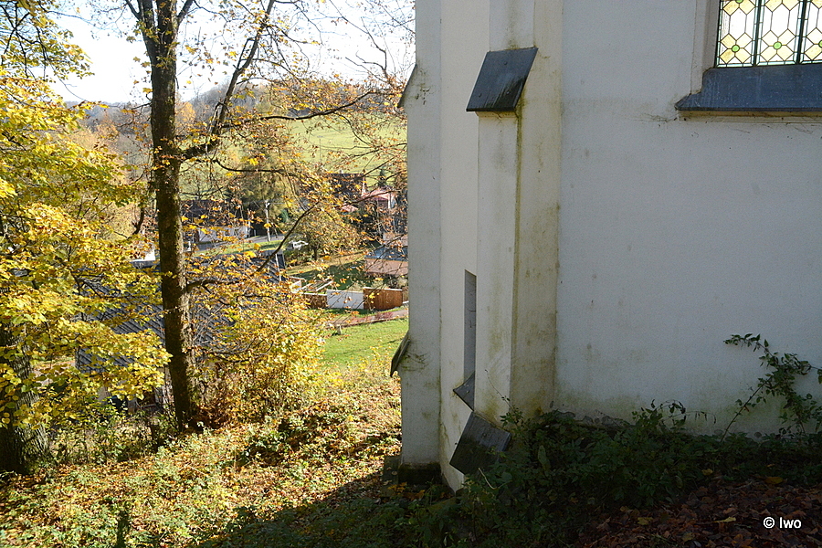 Kostel stojí v mírném svahu, hřbitov kolem něho je proto na svažité straně vyrovnán kamennou zdí. K ní na úrovni kostelní věže přiléhá stavba hrobky, která má vchod ze hřbitova hřbitova, ale pod jeho úrovní další patro na úrovni původního terénu. Jedná se o neogotickou stavbu z roku 1898, kterou nechal vybudovat sklářský podnikatel z Polevska Rudolf Handschke.