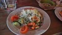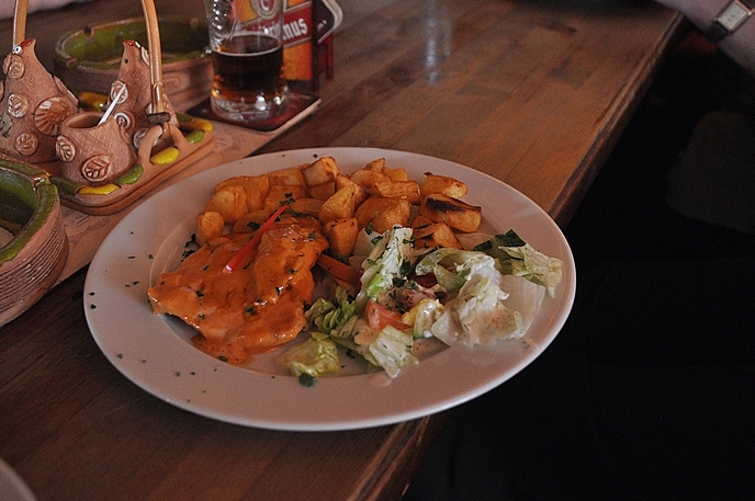 Některým už kručelo v břiše, obkroužili jsme tedy okolí, abychom zjistili, že s nabídkou hospod je to vcelku podobné, jako s tím prodejem knih. Koliba prý funguje jen na objednávku, Bernard měl ceny „lidové“ a tak jsme se nakonec opět sešli s našimi průvodkyněmi ve Čtyřlístku. Jídla přepestrá, ceny přijatelné, humoru plno, jen to čekání nebylo zrovna nejkratší.