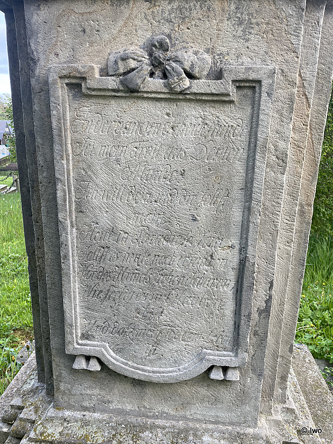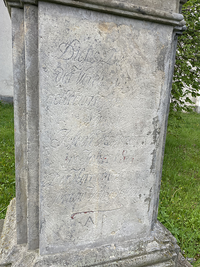 Info je na můj vkus skoupé a nepřesné – není citován nápis z přední strany soklu a vůbec není zmíněna skutečnost, že na zadní straně soklu je zdobná kartuše (třapce vespod, mašle na horním okraji) s dalším nápisem. A proč je pozůstatek kovové skoby právě na této straně soklu, když lucerna se věšela zpředu?