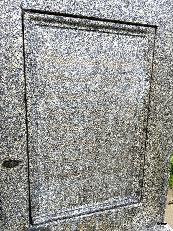Z ulice vede ke kříži schodiště a dlážděná cesta. Pod křížem je vydlážděný osmiúhelný schodový podstavec, na něm je 8 sloupků ze stejného kamene jako sokl kříže, spojených kovovým řetězem, umístěných na nízkém stupni. Následují dva stupně schodů čtvercového půdorysu, na nichž je kamenný sokl. Ten nese na zadní straně jméno donátora a vročení (Errichtet // von // Franz Bienert // 1853) a další nápis na čelní straně. Bohužel nejsem schopen ho přepsat a přetlumočit. Nad nápisem je na hraně soklu pozůstatek držáku lampy. Celé dílo završuje jednoduchý kovový kříž s Kristem.