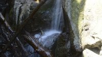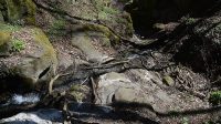 3 – Po sedmi metrech následuje druhý vodopád, který někdy podtéká pseudojeskyni pod zaklíněným balvanem, jindy teče přes tento balvan, podle míry ucpání toku a množství vody. Za mne nejlepší místo – proud vody protéká skulinu pod balvan, z druhé strany v levé části roklinky padá dolů do malé tůňky.