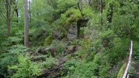 Opakovaná návštěva se vyplatila, bezesporu. Sníh a led zmizel. Rybníček sice takřka zmizel pod bohatou vegetací, ale vody plno a z přepadu se skutečně valí proud, padající do náhle odhalené rokle. Do ní není momentálně problém sestoupit, i když je plná kamení. Neumím odhadnout, zda jde o pozůstatky nějaké stavby, jsou dávno porostlé mechem a ohlazené – ale okolní stěny vykazují známky opracování i v místech, která momentálně nejsou rozumně přístupná, tudíž bych předpokládal, že tu něco kdysi stálo.