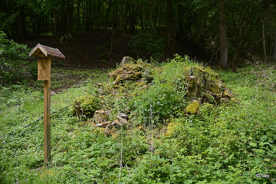 U zbytků základů je postavena dřevěná vypalovaná tabule s vyobrazním kaple a stručným popisem.