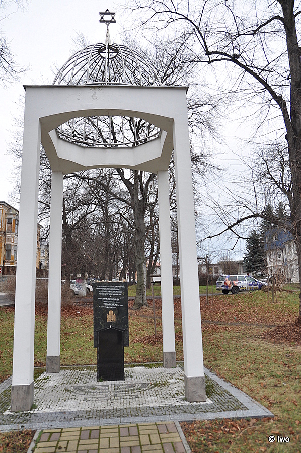 U křižovatky ulic Lípová, Chelčického a Poštovní v Teplicích stojí pomník vypálené židovské synagogy.