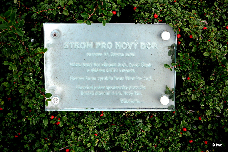 Uprostřed kruhového objezdu ulic Liberecká, Sloupská, Dořákova a třídy T. G. Masaryka před kostelem Nanebevzetí Panny Marie u náměstí Míru v Novém Boru stojí plastika ze skla a kovu s názvem Strom.