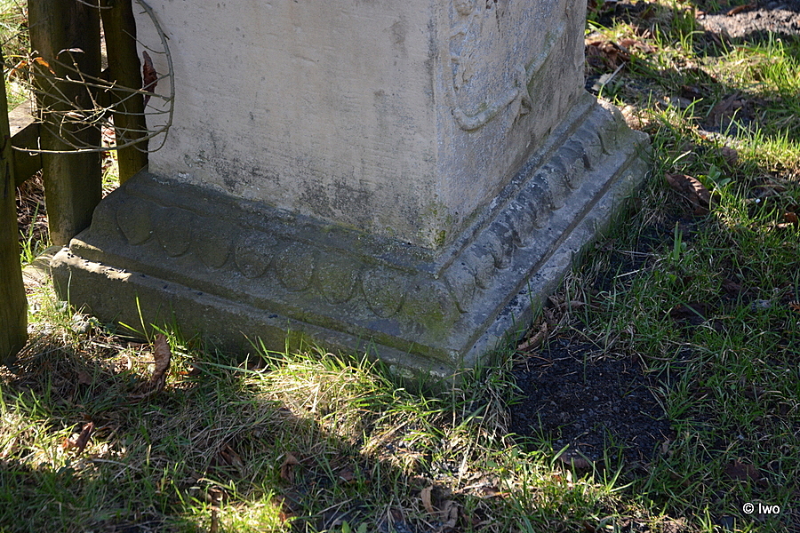 Kvádrový sokl stojí na nizounkém podstavci, jehož horní lišta je ozdobena dekorem. Přední strana soklu v oválném poli, věnčeném reliéfem vinné révy (listy a hrozny), nese nápis. Boky jsou ozdobeny květinovým reliéfem ve svém středu. Hlavice na vrcholu sloupu je velmi zdobná – zespodu má cimbuří, na přední straně trojúhelný štít s listem vinné révy, na rozích „čtvrtkouli s dekorem mušle“, od níž se na bocích zvedají „rampy“ k zadní straně. Na vrchu hlavice useknutý jehlan se vsazeným kovovým křížem. V jeho spodní části čtyři sloupy, spojené horní římsou, na nich oblouk, připomínající dveřní portál, rámovaný trojúhelníkem, jehož dvě vnější strany nesou zuby/trny. Navazuje samotný kříž. Pod nohama Krista hák, zřejmě na zavěšení světla. Konce břeven ozdobeny „trojlístkem“, v místě křížení paprsčitá svatozář ze zadní strany a vpředu nad hlavou Krista květ. Na břevně nahoře věnec s prostorovými písmeny INRI.