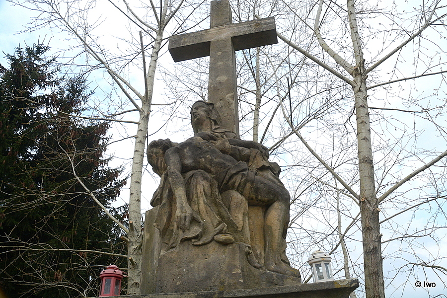 Na hranolovém podstavci zdobeném reliefy s energicky formovanou římsou je vsazena pieta s novějším křížem v pozadí. Pískovec. Datováno 1783, obnoveno 1867 a 1898.