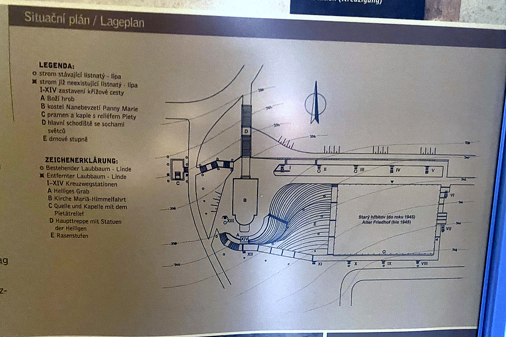 Křížová cesta stoupá do své poloviny obloukem kolem zmíněného starého hřbitova, nahoře u asfaltky, nad níž je nový hřbitov, se otáčí a klesá zpět po schodišti ke kostelíku k Božímu hrobu.