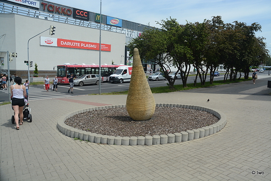V kruhové ploše na chodníku u křižovatky ulic Jaroslava Průchy a třídy Budovatelů v Mostě stojí pískovcová plastika Nemusí pršet, jen když kape.
