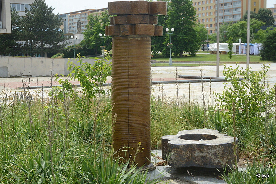 Občas bývá v okolí nebo přímo na plastice štítek, nápověda, nějaké údaje – tady nic, co by jakkoli napovědělo. Vzhledem ke konstelaci se nabízí úvaha, že mohlo jít o nějaké vodní dílo – v dlažbě kanál, spodní nízký díl má nádobu… Ta je aktuálně odpadkovým košem. Sloup je podélně prasklý, nejvyšší obklad – květ je z půlky ulomen, na zemi chybí část dlaždic.