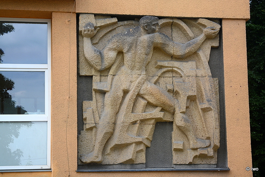 Figurální reliéf Výstavba (někdy též Herkules) koresponduje svým námětem s původní funkcí budovy, která sloužila jako internát pro budoucí horníky. Jednotlivé oblouky na reliéfu znázorňují důlní šachty. Dnes je reliéf pro vzrostlou vegetaci v jeho bezprostředním okolí špatně viditelný (to už není úplně pravda, vegetace byla vykácena).