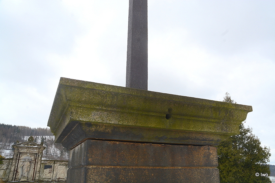 Dva kamenné schodové stupně, na nich nízký kvádr, který má na čelní straně vybrané obdélné zrcadlo s vykrojenými rohy. V černě zbarvené ploše letopočet 1893. Na dvojitou lištu na horní hraně nasedá vlastní sokl tmavší barvy. Jedinou ozdobou je rýha v horní části po obvodu soklu a obdélné pole na čelní straně se vsazenou deskou černé barvy, na níž je nápis Es ist vollbracht!Na vrchu soklu hlavice, postupně se rozšiřující směrem vzhůru. Na přední straně v rozhraní 2. a 3. římsy otvor, v němž byl zřejmě trn pro lampu. V horní rovné ploše vsazen masivní jednoduchý kříž se zlaceným Kristem a tabulkou INRI.