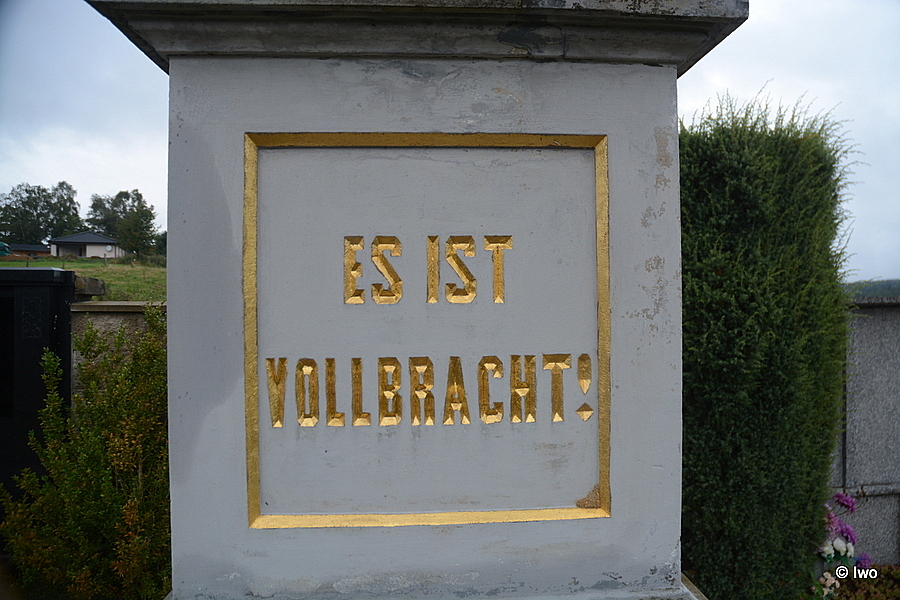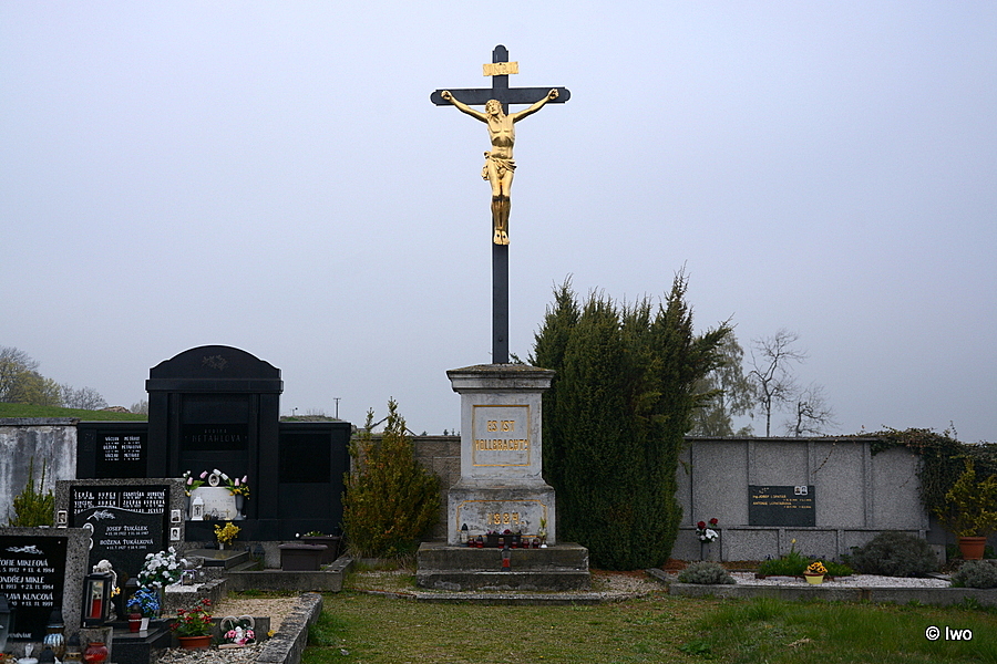 Na konci středové cesty napříč hřbitovem (zhruba ve směru jih-sever) u zdi stojí v prostoru, vysypaném kačírkem, kamenná základna s předním schodem. Na ní dvouetážový sokl, nižší a širší část přechází lištou lištou ve vyšší tělo soklu. Na spodku v ploše, ohraničené rytým obdélníkem s vykrojenými rohy, rytý letopočet 1884 (zlaceno). Na přední ploše těla soklu čtvercové vpadlé zrcadlo, v něm rytý zlacený nápis ES IST VOLLBRACHT! Na nízké hlavici mohutný kovový plochý kříž se zlacenou sochou Krista, nad jehož hlavou menší cedule INRI. Kříž je podepřen dlouhou tyčí, která je atypicky ukotvena do hřbitovní zdi.