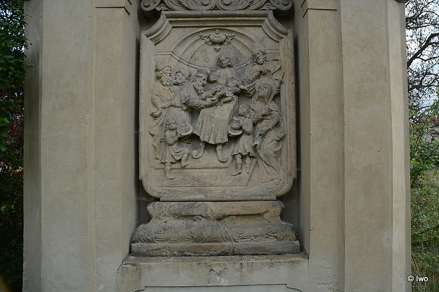 Ve výklenku kaple je umístěný reliéf s výjevem Obřezání Krista. Stojí na podstavci, tvořeném dolní římsou, konvex-konkávní částí, zdobenou zvlněným dekorem, a užší horní římsou. Vlastní reliéf, o dost nižší než výklenek, má obdélný tvar – nahoře s dovnitř vykrojenými rohy, dole s rohy zaoblenými. Výjev lemuje profilovaný rám. Reliéf zobrazuje obřezání Krista v chrámu. Uprostřed scény je dvojitý stupínek, na němž stojí obdélný stůl – na nohách, dole zahnutých směrem vně (vidět jsou pouze dvě přední). Stůl, pokrytý látkou, spadající po stranách dolů a zakončenou třásňovým lemem, je orientovaný mírně šikmo doprava (z hlediska pozorovatele). Na zadní části stolu spočívá Ježíšek, oděný pouze do bederní roušky. Z jeho postavy dnes chybí hlava, pravá paže s rukou a část pravého chodidla. Nohy jsou pokrčené v kolenou a od sebe oddálené – levá noha leží na stole, pozdviženou pravou nohu přidržuje za chodidlo postava vlevo od stolu. Horní část Ježíškova těla, nacházející se již mimo stůl, se opírá o osobu, stojící za Ježíškem. Ježíškova levá paže směřuje kolmo od těla, ruka má otevřenou dlaň s nataženými prsty. Vpravo od stolu (z hlediska pozorovatele) stojí tři osoby – nejblíže stolu chlapec se džbánem, vpravo od něj P. Marie a za P. Marií sv. Josef. Chlapec se džbánem, stojící na širší dolní části stupínku, je situovaný en face. Oblečený je do šatu s řasnatou dolní částí a s dlouhými rukávy s manžetou. Pod šatem je vidět část kalhot, sahajících pod kolena. Chlapec má boty s řemínky na holeni a s podvazky (?). Obě paže jsou ohnuté v lokti před tělem – níže situovaná pravá ruka přidržuje zespodu umyvadlo s širokým okrajem, pozdvižená levá ruka drží za ucho džbán. Chlapec má na hlavě, lehce natočené k pravému rameni, dlouhé vlnité vlasy. Vpravo od chlapce – na podlaze, tvořené čtvercovými dlaždicemi – stojí čelně situovaná Panna Marie. Oblečená je do přepásaného dlouhého šatu s dlouhými rukávy a do pláště, přecházejícího pod její levou paží dopředu, kde ho přidržuje rukou. Pod dolním okrajem oděvu je vidět část levé boty. Obě paže jsou ohnuté v lokti před tělem – levá níže, ruka přidržuje plášť. Pravá paže je situovaná výše, ruka spočívá dlaní s nataženými prsty na hrudi, probodnuté v tomto místě (v oblasti srdce) mečem. Meč, směřující podél Mariiny hlavy šikmo nahoru doprava (z hlediska pozorovatele), má tordovaný jilec. Hlava P. Marie, natočená k pravému rameni a pozdvižená, je krytá rouškou, splývající přes ramena na záda. Oči hledí směrem k Ježíškovi, tvář má bolestný výraz. Kolem Mariiny hlavy je svatozář, členěná do stejně dlouhých, vedle sebe umístěných paprsků. Za P. Marií stojí čelně sv. Josef – dolní část jeho postavy je Marií zakrytá. Oblečený je do šatu s dlouhým rukávem a pláště, který rozevlátě přechází ze zad dopředu – přes levou paži a pod paží pravou. Obě paže jsou ohnuté v lokti – pravá je pozdvižená, ruka se zahnutými prsty spočívá na hrudi. Levá paže směřuje dolů, ruka přidržuje za čepel meč, vetknutý do těla P. Marie. Jilec meče a část Josefova pláště přesahuje až na rám, lemující celý reliéf. Světcova hlava je nakloněná k pravému rameni, oči hledí dolů, ústa jsou pootevřená. Na čele jsou vodorovné vrásky. Sv. Josef má delší vlnité vlasy, na bradě pak krátký vlnitý plnovous. Za jeho hlavou je plošná svatozář