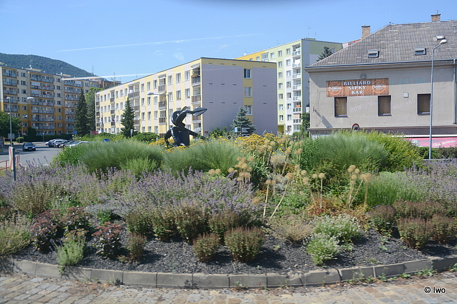 Na vrcholu mírného pahorku na kruhovém objezdu ulic Dlouhá, Osvoboditelů a silnice č. 30 v Lovosicích mezi květinami leží kotva.