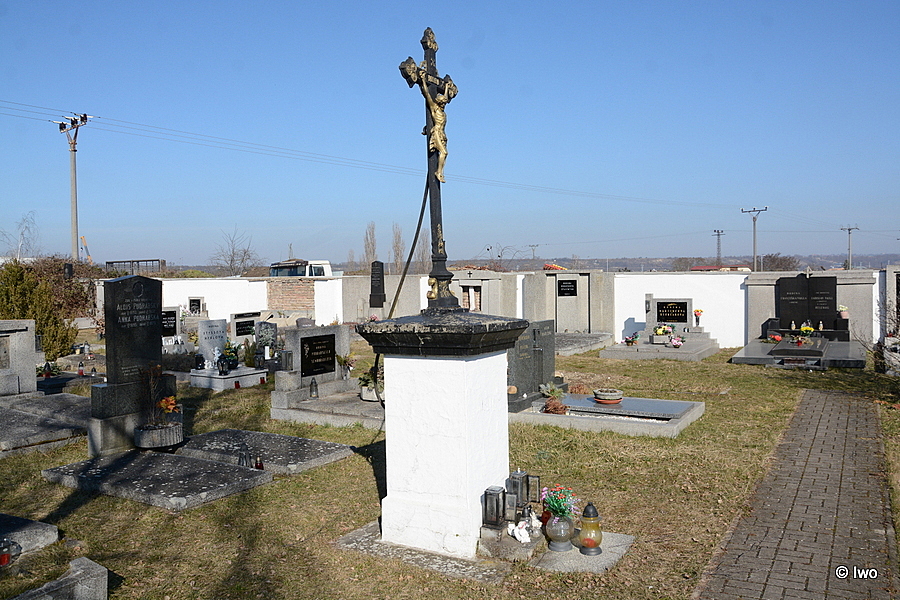 V trávě mezi hroby stojí nabílený sokl, ve spodní části mírně širší. Ošuntělý povrch, místy popraskaný, na čelní straně obtížně rozeznatelná letopočet 1916. V odstupňované přesahující hlavici na vrchu soklu vsazen kovový kříž, upevněný zadní vzpěrou, kotvenou na zadní straně soklu. Masivní kříž je ve spodní části rozšířen, ozdoben zlacenými vinnými listy, po stranách další ozdoby. O něco výš další rostlinný ornament. Konce břeven do trojlístku, v každém výběžku zlacený kulatý reliéf (zřejmě další vinné listy). Nápis INRI na příčném břevně. V místě křížení trámů zlacený kruh s výřezy. U rukou ukřižovaného Krista a nad jeho hlavou zlaté křížky, ztvárněné na koso.