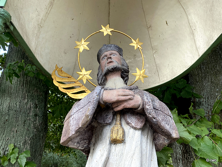 Socha zvláštní – je štafírovaná, což se příliš často nevidí, navíc ukrytá pod speciální stříškou na třech nohách.
