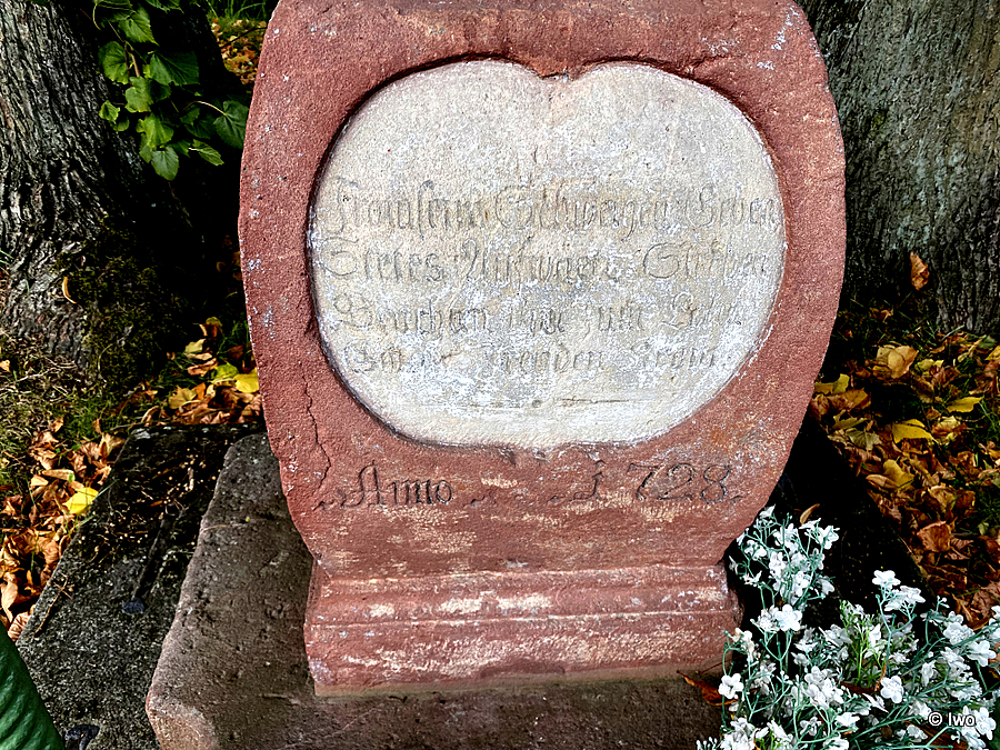 Poctivé natěračské snahy renovátorů ji dnes úplně zakryly hutnou barevnou slupkou, proto je viditelný pouze letopočet 1728. Nápis „Zbožný, mlčenlivý a štědrý / směřoval stále vzhůru, za což se mu dostalo odměny / koruny věčné radosti“ slízl čas. V originále text zněl „From seyn, Schweigen, Geben / stets auf wärts streben / Brachten ihm zum Lohn / Ewiger Freuden Kron“.