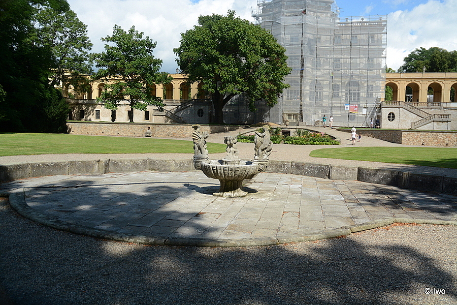 - Malá kašna vlevo v terasní zdi pod schodištěm v zahradě zámku v Ploskovicích