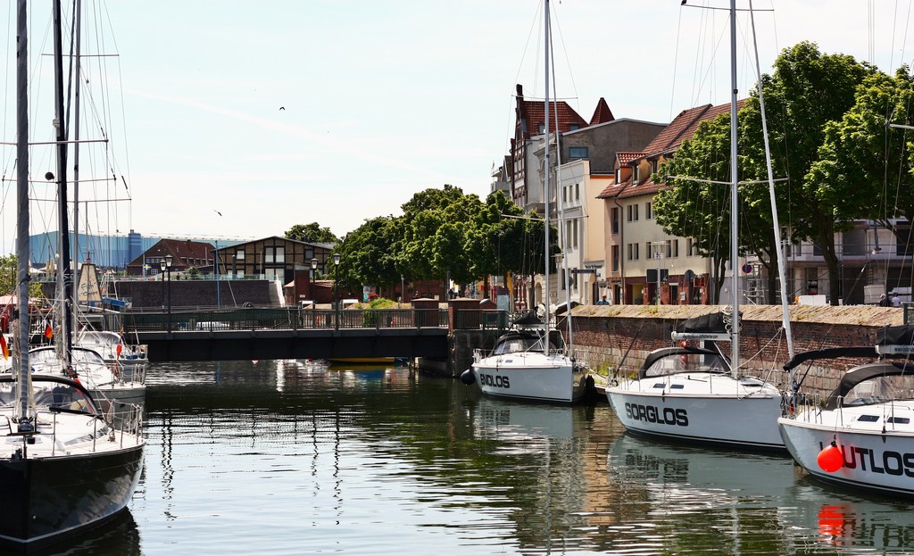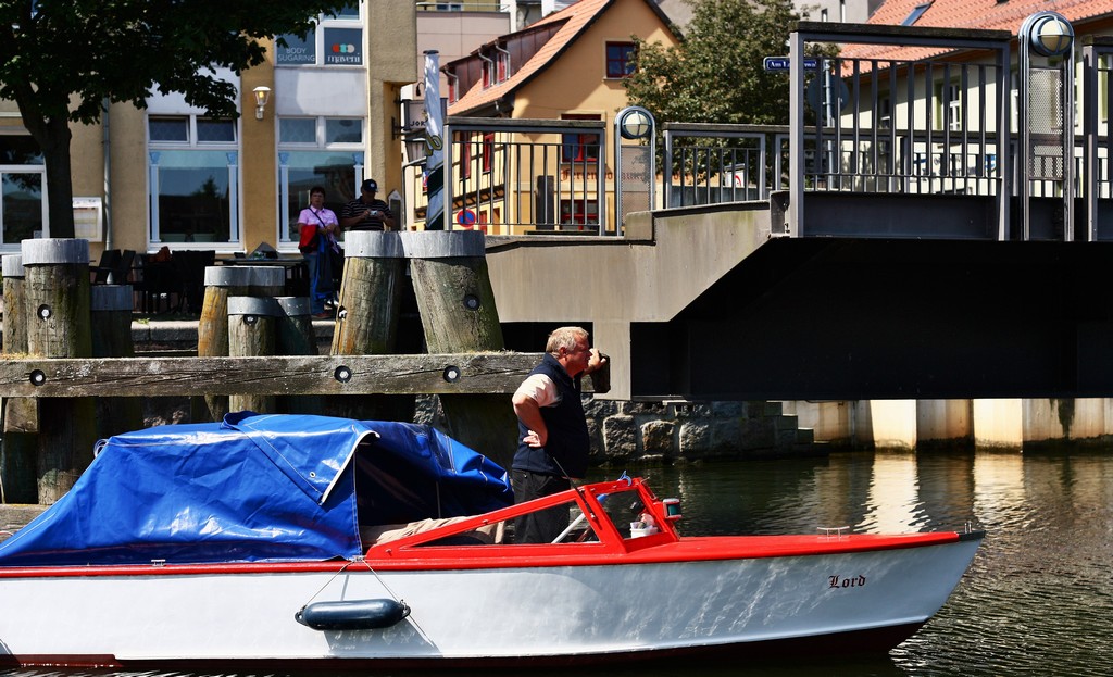 Ještě jedna zvláštnost ve Stralsundu přilákala naši pozornost – otáčecí most. Viděl jsem už most, který se zvedá, to není nic neobvyklého, ale tady v přístavu se most jako celek zvedne asi o metr a otočí se o devadesát stupňů. Plachetnice pak můžou bez problému zaplout až ke kotvišti.