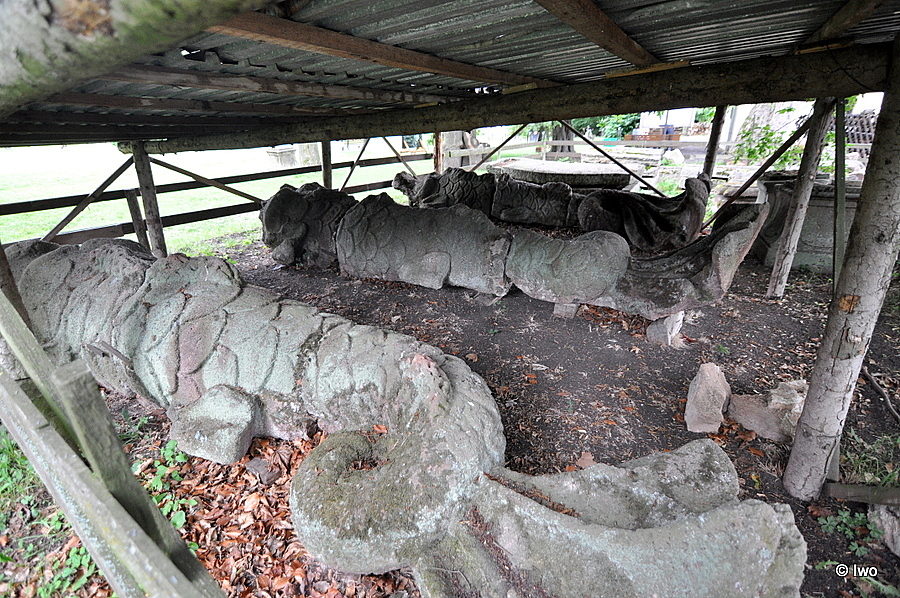 Fragmenty kamenných vodních stvůr ale můžete vidět schované pod přístřeškem nedalekého informačního centra v zámeckém parku. Fantazie autorů soch byla opravdu bujná. Sochy vypadají jako příšery vyobrazované na středověkých mapách.