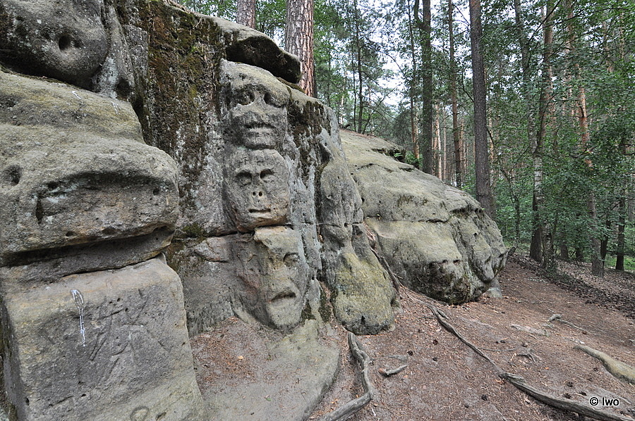 Rozsáhlý cyklus vytesaný po obvodu nízké pískovcové skalky z její jižní a západní strany v pásu cca 20 m. Hlavní postava Harfenice zobrazuje sedící ženu v lehce nadživotní velikosti, obklopenou řadou pitvorných obřích tváří umístěných až u země. Cyklus pokračuje plynule dále od cesty stylizovanou jeskyní, jejíž vchod je rámován řadou menších tváří.