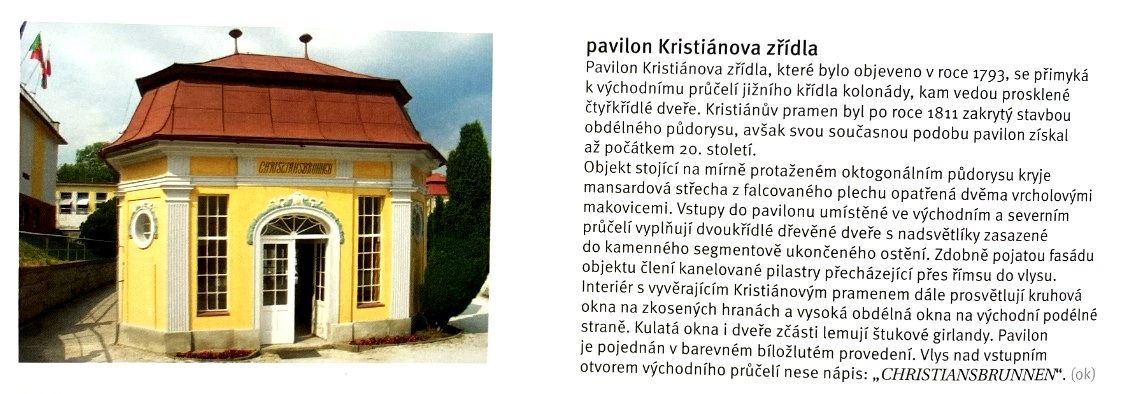 Pavilon zřídla Kristiánova na východním konci kolonády, mírně protáhlá oktagon s mansardovou střechou, fasáda členěná vysokým kladím na toskánských pilastrech. V hlavních stěnách prosklené dveře v šambráně se stlačeným záklenkem, ve zbývajících stěnách oválná okna.