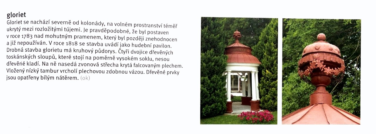 Gloriet se nachází severně od kolonády, na volném prostranství téměř ukrytý mezi rozložitými tújemi. Je pravděpodobné, že byl postaven v roce 1783 nad mohutným pramenem, který byl později znehodnocen a již nepoužíván. V roce 1818 se stavba uvádí jako hudební pavilon.