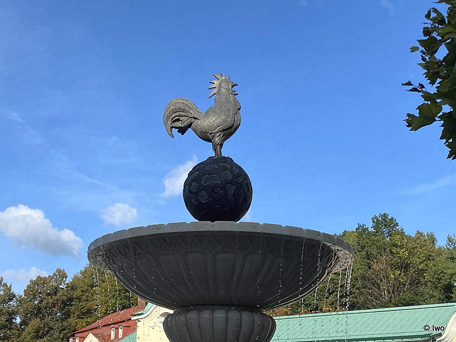V dlažbě kolonády kruhový kamenný základ. Na něm užší květinovým reliéfem ozdobená vana mramorového vzhledu. Uprostřed nízký sloupový sokl, na němž zády k sobě stojí trojice mladých žen s rukama nad hlavou. Za zády mají sloup pokrytý reliéfem růžových květů. Nad jejich rukama malá mušle, na níž sedí široká nízká nádoba, v jejímž středu na kouli stojí „bájný“ kohout, s nímž je spojena legenda o vzniku lázní.