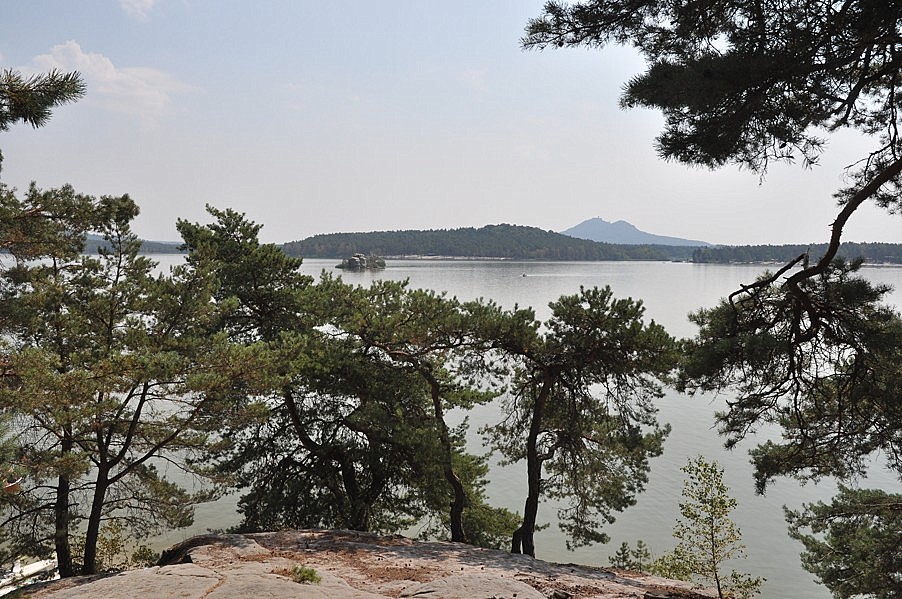 Co mě štve víc, je skutečnost, že i když se o téhle skále píše (a kreslí) i na tabuli Naučné stezky se Čtyřlítkem, tak k této „jediné“ zdejší pamětihodnosti není nikde k vidění jedna jediná směrovka, takže trochu bloudím. Aspoň si cestou prohlédnu zdejší místy honosnou výstavbu. No a pak šok – zatímco na hrázi to u stejné vody bylo zadarmo, tady („tropický“ Aquapark) je vlezné 150 na osobu, takže potkávám rodinky, které zhnuseně od vstupu nabírají opačný směr než k vodě. Paní u boudy, ke které jsem přišel, mi ukazuje cestičku podél plotu ke druhému vstupu, tam že je to ke skále blíž, a že mi tam vystaví „průchodku“. Ano, je to tak – za desetikačku dostanu na ruku pásku s vyznačeným časovým limitem 30 minut, takže se ke skále nakonec dostanu. A můj dojem? Tenhle článek -> je pravda a nic než pravda a nikdo s tím asi nic nenadělá. Ještě se vyšplhám i na hřbet skály, pokochám se výhledem a po opuštění areálu po červené značce podél břehu kolem dalších pláží a hotelů mířím na nádraží do Doks. Ty si nechám na někdy příště.
