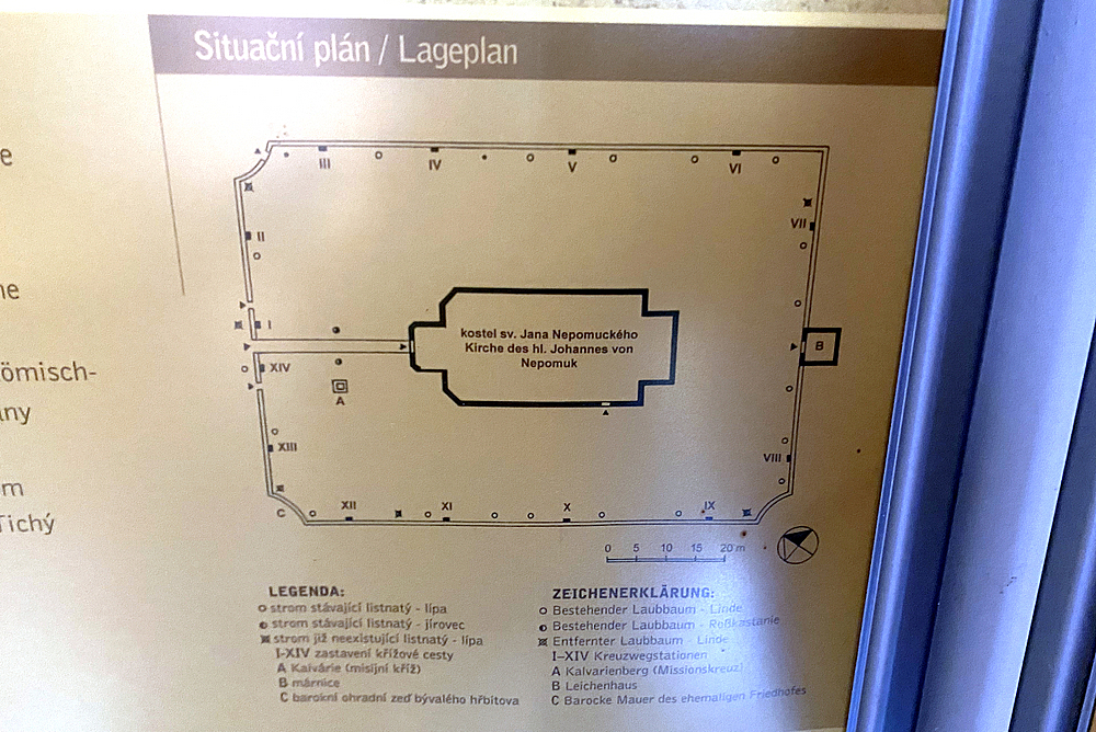 Po vnitřním obvodu zdi bývalého hřbitova je umístěno 14 sloupků, v nichž jsou dnes umístěny fotografie dřevěných reliéfů z roku 1922. Faktem je, že za vhodného světla občas člověk až zapochybuje, že jde o fotografie, chvílemi se zdá, že některé prvky vystupují z plochy. Sloupky jsou v docela slušném stavu, i když nápisy na nich příliš čitelné nejsou. Podle brožury jsou některé připomínkou donátorů (např. 1825 – Ignatz Wünsche).