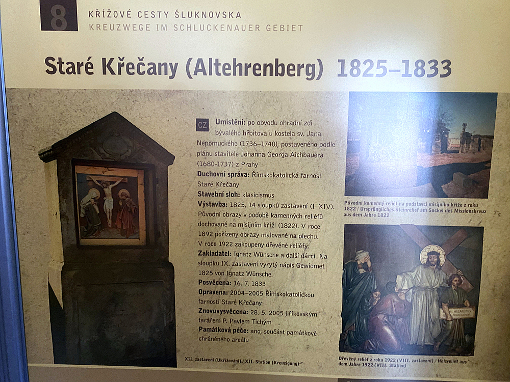 Po delší době tedy velím – brožuru Křížové cesty Šluknovska do ruky, strana 18 a 19. A nejlépe by bylo přidat k ní ještě jednu. Úplně stejný formát, shodná grafická úprava a částečně i tvůrčí tým. Jmenuje se Kostel sv. Jana Nepomuckého ve Starých Křečanech – průvodce po stavební historii a uměleckém významu. Když už jdeme kolem zdi, proč se nepodívat i doprostřed, ne? I když to je spíš úkol pro samostudium, věnovat se budu především další křížové cestě.