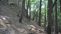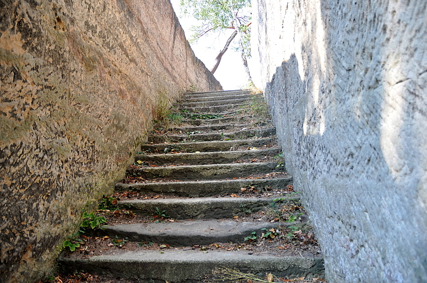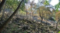 Zanořím se hlouběji do lesa a zleva mě překvapí přicházející žlutá, kterou jsem ztratil. V řídkém lese, stoupajícím poměrně strmě vzhůru, je cosi jako zbytky lomů (jo, v Německu by u toho už dávno stála tabulka s vysvětlivkami) a o kousek dál zbytky jakéhosi stavení… A taky potkávám lidi. Až překvapivě hodně lidí. Když jsem se o něco později s nimi dal do řeči, šlo o partu od Plzně, která v loňském roce brázdila Lužické hory a letos Kokořínsko. A ta malá holčička s nima statečně šlapala po svých, fakticky až nahoru! Já zatím odbočuji k Juliině vyhlídce (11:00).