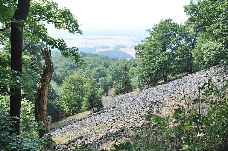 Na rozdíl od většiny příchozích a odchozích, kteří se vracejí k autům do Vranova, já pokračuji po červené dál (tím pádem už sám). Zdaleka to není tak atraktivní a „příjemná“ cesta jako z druhé strany. Daleko víc otevřená (slunce pálí jak ďas), místo lesních stezek cesta pro těžkou mechanizaci. To nejhorší mne ale teprve čeká. Když se dostanu na rovinu, výhled zpátky je sice fotogenický, ale pokrývá mne prach zvířený nedaleko pracujícími kombajny. A pak děs a běs. Z Novin pod Ralskem už jen po asfaltce. Krátce se zastavuji u Průrvy Ploučnice a až doma se dodatečně proklínám, že jsem si nenastudoval dopředu, co všechno tu je k vidění. Snad někdy příště, stejně pospíchám do Stráže pod Ralskem na přípoj na cestu domů. Tajně si myslím na spoj, který ve 14:20 odjíždí směrem na Hrádek nad Nisou, kde bych přeskočil do Trilexu. Ovšem cesta po silnici je prostě a jednoduše příšerná a vyčerpávající a na autobusák ve Stráži vstupuji přesně v okamžiku, kdy autobus odjíždí… No nic, pět minut nato jede bus do České Lípy, kde přestoupím na Quick. Ovšem pro příště si slibuji, že budu nosit nejen víc trik, ale naučím se přibalit si i pití, ta dnešní dehydratace mi dala dost zabrat.