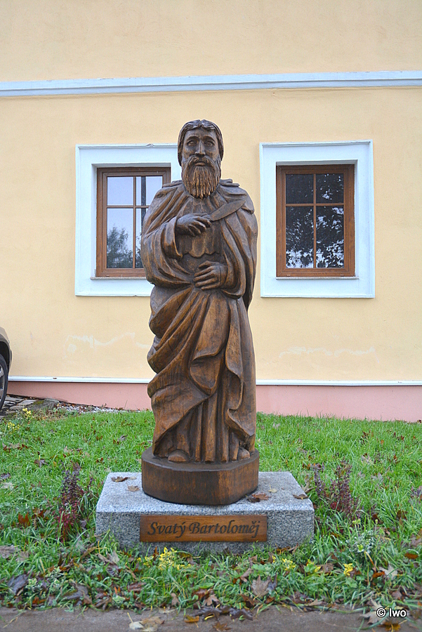 O soše nikde na rozdíl od nedalekého svatého Jana ani slovo. Těžko hádat, zda ji stvořil stejný autor. Web obce pouze zmiňuje samotnou faru: „Patrová budova, postavená na místě starší fary, doložené již 1567„. Jasné je pouze to, že socha je inspirována zasvěcením kostela. Pokud hádám správně, má světec oděný v říze v ruce jeden ze svých atributů – nůž na sdírání kůže. A to proto, že dle legendy byl stažen z kůže…