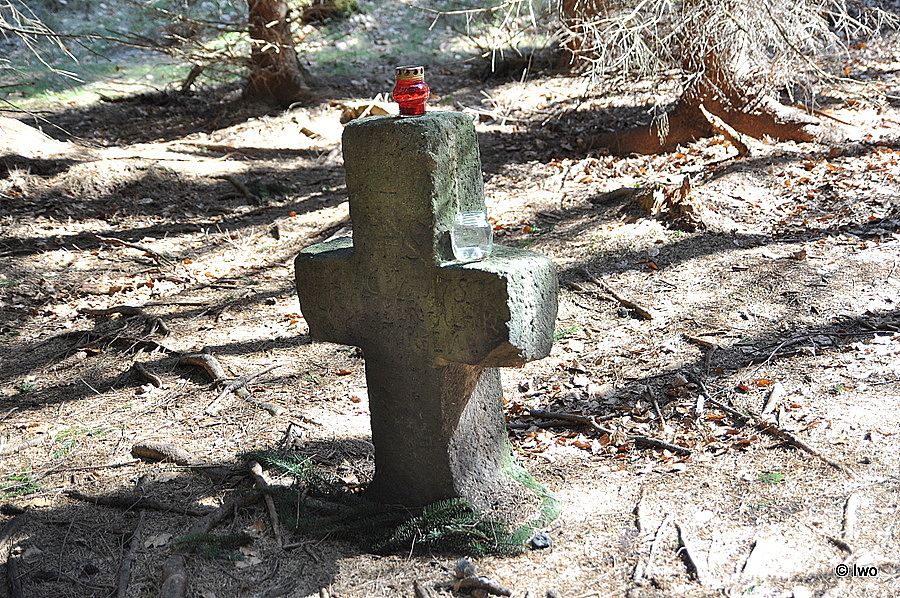 Pravidelný, téměř metr vysoký kamenný kříž s nápisem IHS HCWG AO 1753 21.OCTOPER ALHIR GESTORBEN na přední straně (text praví, že 21. říjne 1753 zde někdo zemřel). Stojí v mladém smrkovém lese jihovýchodně od Tomášova, vlevo od cesty, odbočující ze Zlodějské stezky jen několik desítek metrů od silnice Tomášov – Mikulášovice k jihozápadu.