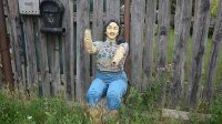 Na západním okraji obce Velká Bučina (dnes součást Velvar) v postranní uličce sedí před prkenným plotem u branky do zahrady socha z Lega.