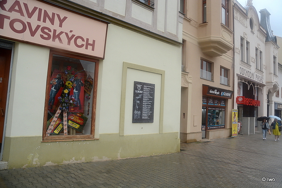 Na fasádě domu čp. 11 na Husově náměstí v Rakovníku je umístěna pamětní deska pilotům RAF.