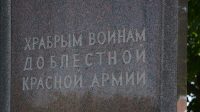 Pomník 2. sv. války sovět. vojákům zhotovený z červené leštěné žuly. Na základní desce je umístěn kvádr vzhůru se rozšiřující, zakončený deskou s vystupujícím hrotem hvězdy. Na dříku vytesán a vyzlacen nápis azbukou, v překladu. Umístěn pod vzrostlou zelení.