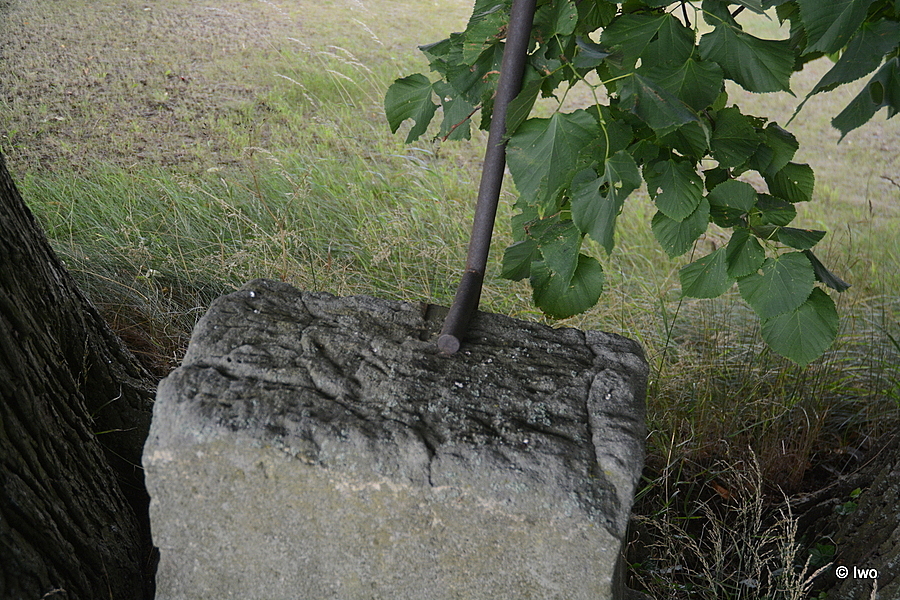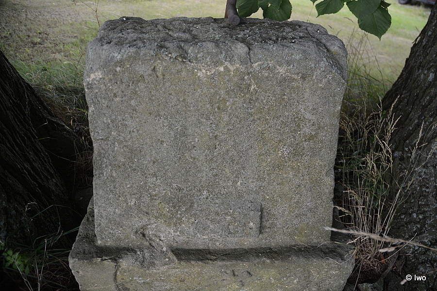 Mezi dvěma vzrostlými stromy zbytky toho, co bývalo křížem. Nízká kvádrová základna obdélného půdorysu má na přední straně reliéf šikmo položeného kříže. Na základně stojí blok se vzhůru se zužujícími stěnami. Není ale zřejmě kompletní, ke konci je patrné mírné rozšíření a horní strana nasvědčuje tomu, že kámen byl přeražen. Ve spodní části čelní strany vyvýšené pole obdélného tvaru. Sokl je doplněn křížem z kovové kulatiny.