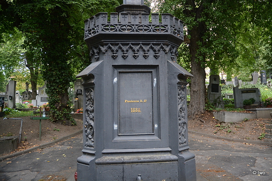 Středové kříže jsou litinové, rozdělují hřbitovní pole.
