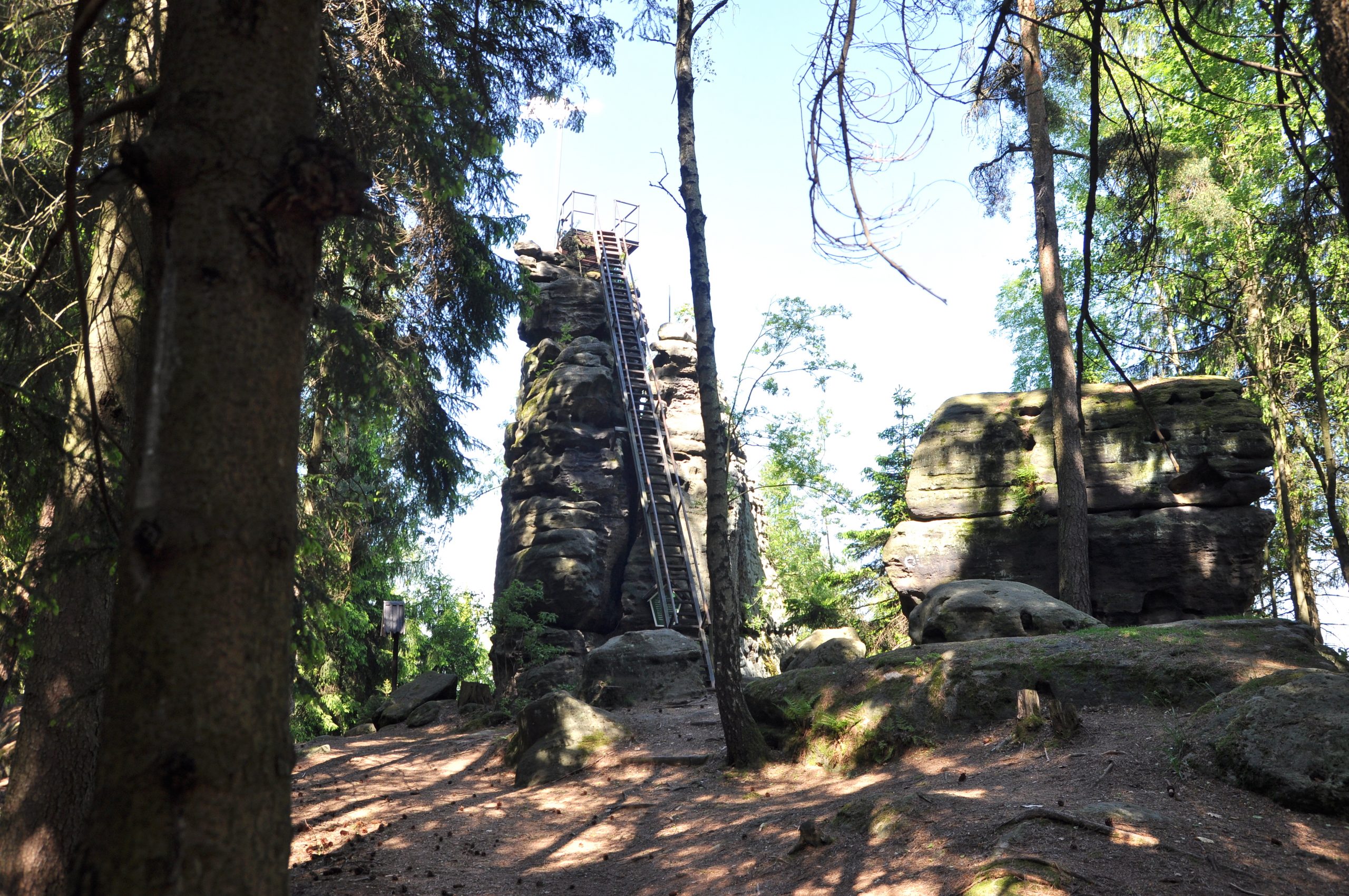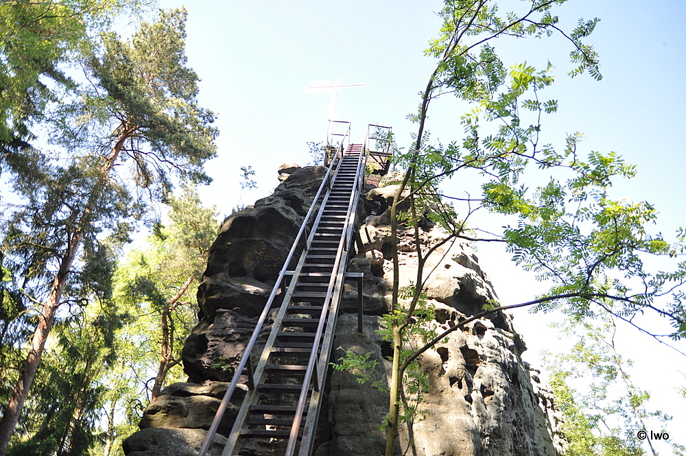 Když mne v roce 2017 vyslal Jirka Rak v rámci procházení Top tras i do těchto končin, neměl jsem vůbec tušení, do čeho jdu. Tenhle kout za hranicemi jsem neznal. A po pravdě, když jsem od Rosenthalu bloudil po německém „značení“, dle mého někoho, kdo má v pískovcích trochu nachozeno, neměl čím překvapit. Což jsem si myslel do doby, než jsem stanul pod tímto skaliskem, které se v lesním porostu vyloupne zcela nečekaně. Pískovcový suk tu trčí z ničeho nic, a při pohledu zdola na strmý kovový skorožebřík se člověku zatočí hlava. Nahoře plošinka skoro jako dlaň, a výhled perfektní, byť jen na jednu stranu (opačným směrem les). Má tohle místo nevýhodu, že v jeho okolí není nic extra úchvatného a vyhlášeného, aby mohlo být zahrnuto do nějaké vycházky jako vedlejší cíl – je třeba se k němu (a nedaleké vyhlídce Signal) vypravit extra.