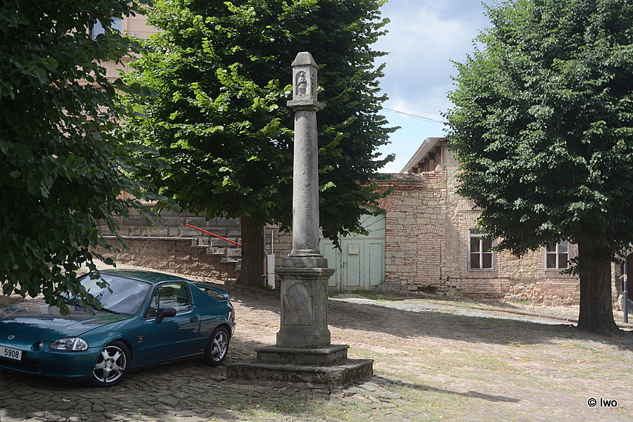 Materiálem je pískovec. Z plintu, posazeném na hranolovém soklu, vyrůstá sloup s hladkým dříkem, který místo hlavice nese čtyřboký kapličkovitý útvar. Jeho stěny jsou členěny velkými nikami, do nichž jsou vloženy reliéfní postavy čtyř světců – sv. Jana Nep., sv. Floriána na severu, sv. Ludmily na východě a sv. Václava na západě. Čelní hrana postamentu je zdobena rýsovaným obloukem uzavřeným zrcadlem, které je vyplněno/maskulním/ majuskulním nápisem: EX VOTO/ANTONIUS/MAETINUS/PICKAR/GUM/UXOHE SUA/POLEXINA/. Nad zrcadlem je letopočet ANO 1709.