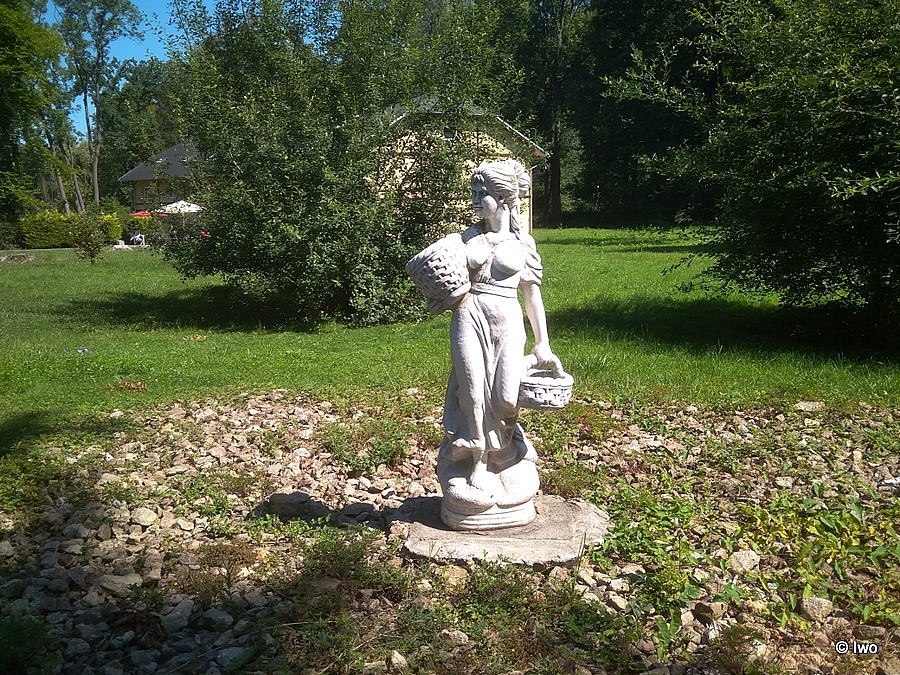 Na původně kamenitém prostranství, které postupně zarůstá plevelem, stojí uprostřed na hrubě vybetonované základně na malém soklíku ženská postava. Bosa, oděna v jednoduchou řízu, pravou nohu nakročenou vpřed, hlava s upnutými dlouhými vlasy stočena vpravo. V pravé ruce u pasu podpírá hlubokou ošatku, v levé ruce, spuštěné podél těla, nese mělký košík. Dle poměrně hrubého zpracování bych tipoval nějaký sériový zahradní výrobek, ale těžko hádat – nikde o soše ani zmínka.