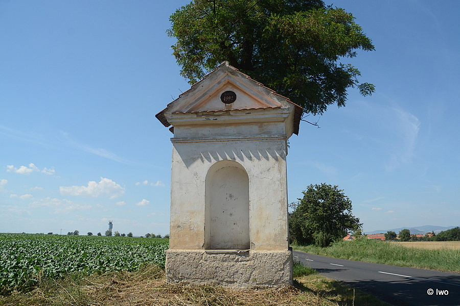 Při silnici do Račiněvsi zděná, omítaná kaple stojící na vysokém soklu, s výklenky na všech 4 stranách, a s trojúhelným štítem po obvodu profilovaným, zřejmě z poč. 19. století.