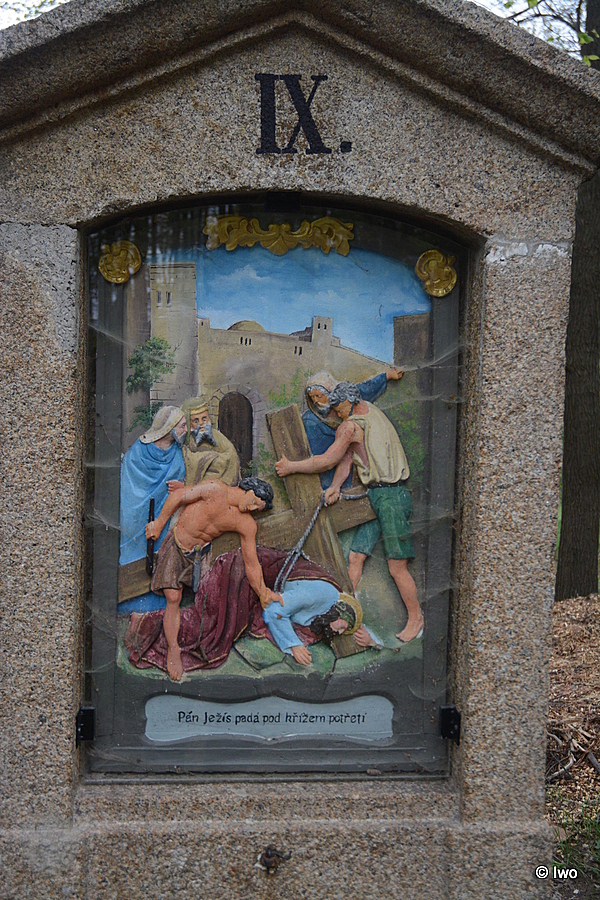 Od úvodního sloupku s Poslední večeří vedla původní cesta zcela jasně o kus vedle – rygol se zbytky vzrostlých stromů je stále jasně patrný. Na začátku křížové cesty vpravo ve svahu jsou patrny kamenné stupně, snad kdysi místo Gestemanské zahrady. První kaplička (asi žalář Krista) svítí novotou. Kaple Bičování Krista také, ruina vpravo od ní stále čeká. Celá křížová cesta má 15 zastavení + úvodní Poslední večeři, sloupků je však o 2 méně – XII. zastavení nahrazuje otevření kaple Kalvárie a místo XIV. zastavení se skví obnovovaná kaple Božího hrobu. Nové reliéfy jsou ve všech zastaveních. Chápu, z jakého důvodu jsou za sklem, nicméně budou-li pavouci tak akční, jako v minulých letech, brzy z reliéfů nebude nic vidět. Bohužel, u některých to možná bude dobře (zastavení X. se z neznámého důvodu loupe a opadává). Více ve fotografiích: