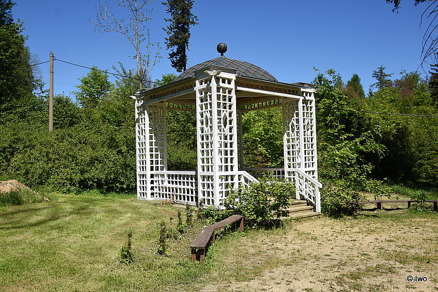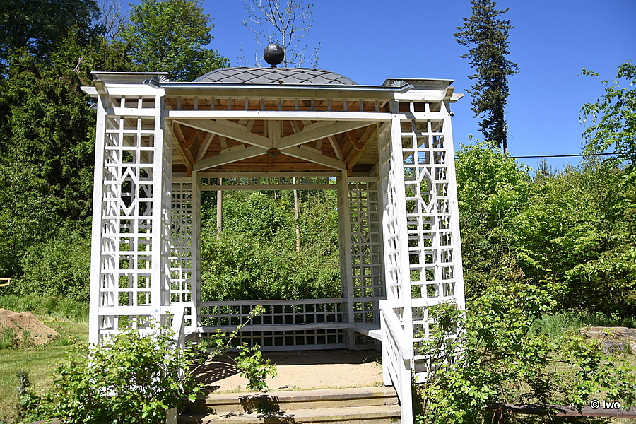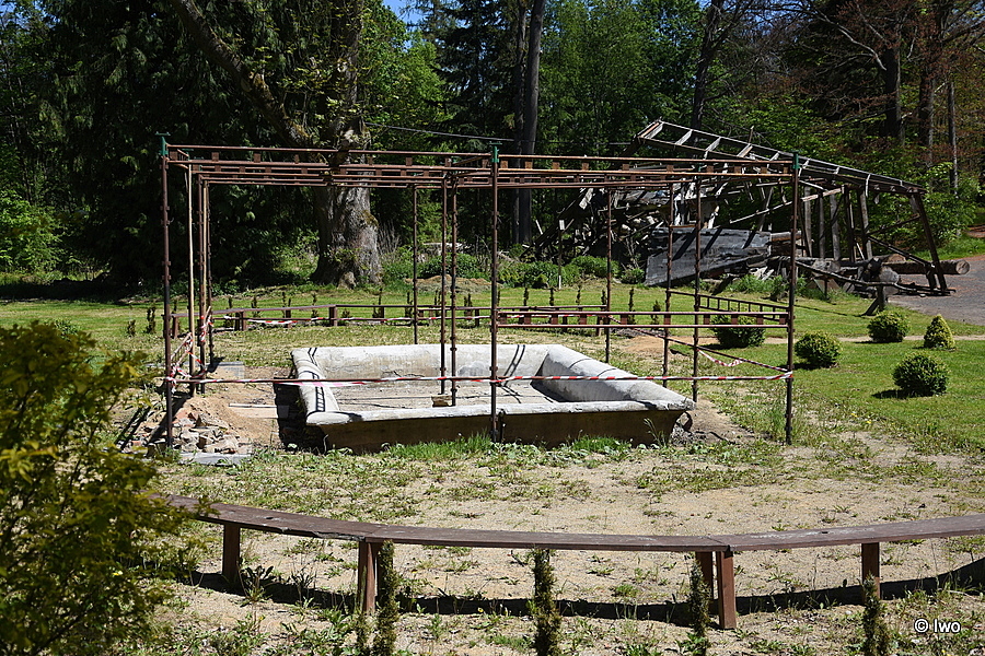 Z původní dřevěné boudy vznikla hospůdka „Modrá koule“. O kousek dál pan Schütz postavil jednoduchý cihlový dům – restauraci. Dále přistavěl půlkulatou stavbu pro opičky, které přitahovaly hlavně dětské návštěvníky. Vznikl čínský pavilon nad rybníčkem s půjčovnou lodiček, četné altánky s lavičkami a třeba i pomník německému otci tělovýchovy Friedrichu Ludwigu Jahnovi. Lesy se vzrostlými obrovskými smrky a pěstěnými keři byly protkány promenádními cestičkami, vedoucími kolem umělých jezírek. Dětem sloužily i další atrakce, jako třeba klikou poháněný vodní kolotoč sestávající z několika loděk připevněných latěmi ke středovému kůlu, který je vidět na několika historických snímcích.