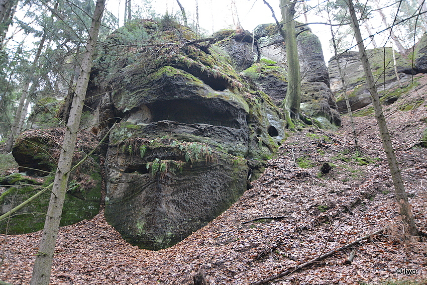 Zpět (celkem cca +30 minut od silnice) a lesem k další v pískovci vytesané jeskyňce – ale je potřeba mít oči na stopkách, Poustevnu jsem málem přehlédl. Od ní je to jen kousek na Tisový vrch (15 minut), kde je dokonce panoramatická tabule a částečně seřezán mladý porost. Zbývá už jen dokončit oblouk lesem a ocitám se opět u Hlídkové jeskyně, přes Modlivý důl zpět a za necelou půlhodinu nasedám do auta. A je konec výletu.